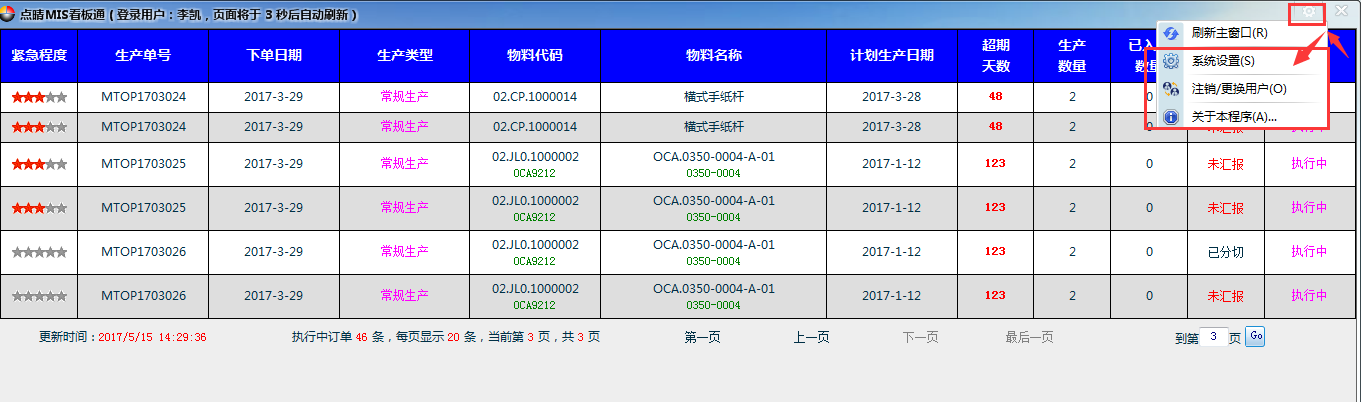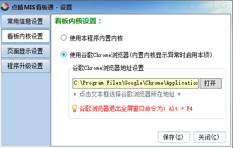 可以使用本程序自带的内核显示看板内容。如果本程序自带内核显示看板异常,那么可以使用谷歌浏览器来显示看板内容。 “页面显示设置”: 说明:此功能可设置需要在看板中显示的页面网址,显示字体类型、字体大小、每行高度、页面行数显示等信息。 注销更换用户:点击后退出本账户,进入登陆界面。 关于本系统:点击可查看系统的信息,如下图所示: 车间效果展现: