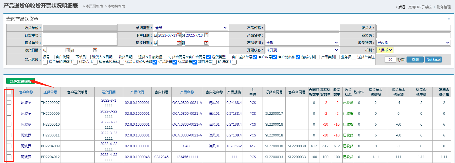 勾上需要对账的明细,点击选择发票明细按钮