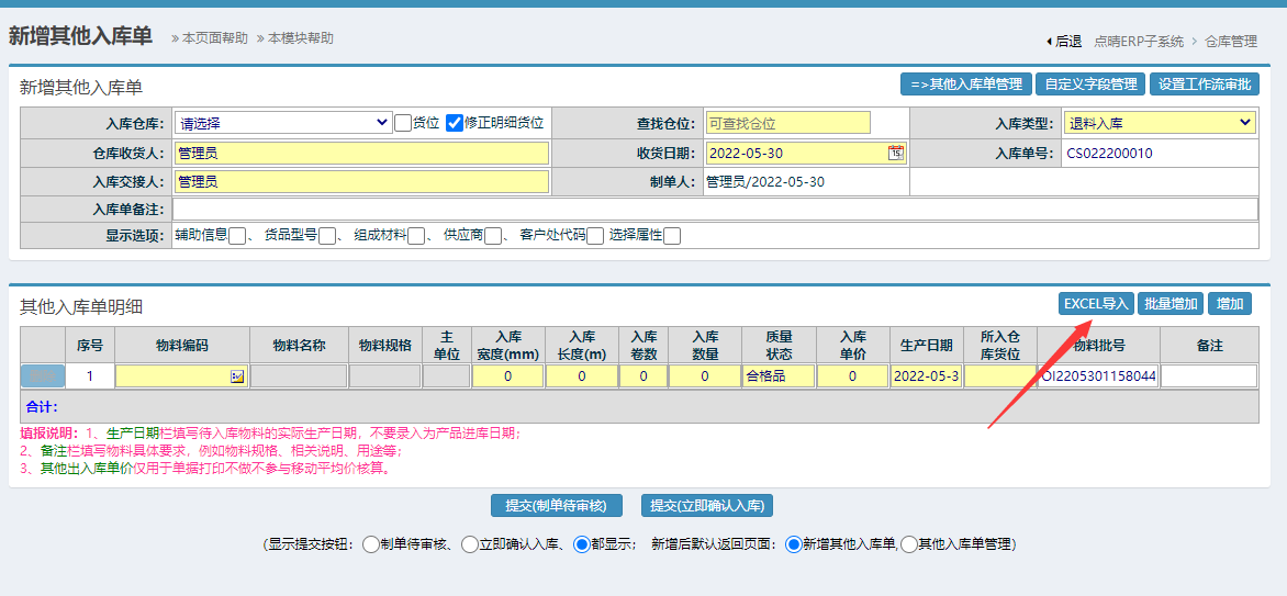 系统初始化如何导入库存数据![]() 一、首先准备好需要导入的excel模板数据(Excel模板找点晴实施工程师提供样式) 步骤:仓库管理-物料入库管理-其他入库管理-新增其他入库单