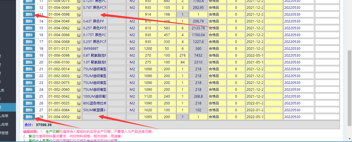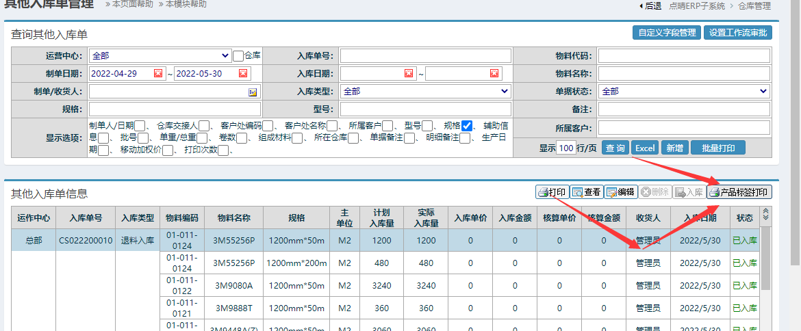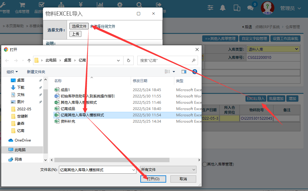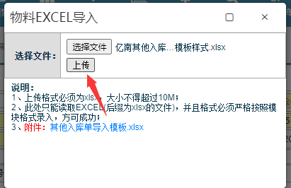 进入界面后,点击excel按钮: 选择对应的模板:删除与系统不批对的物料编号(该编号要反馈给工程进行资料补充) 点击提交完成操作。 二、标签打印操作---操作步骤:仓库管理-物料入库管理-其他入库管理-其他入库管理 点击对应单据,再点击产品标签打印按钮完成。点晴模切ERP更多信息:https://moqie.clicksun.cn,联系电话:4001861886 该文章在 2022/12/6 15:53:23 编辑过 |