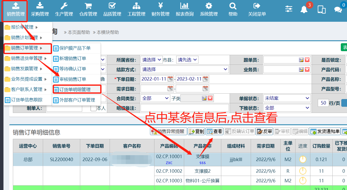 如何销售转申购时删除某项明细?![]() 进入销售订单管理,点中某条信息后,点击查看如下图: