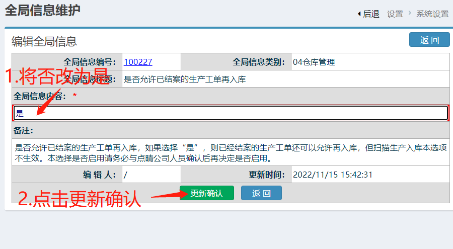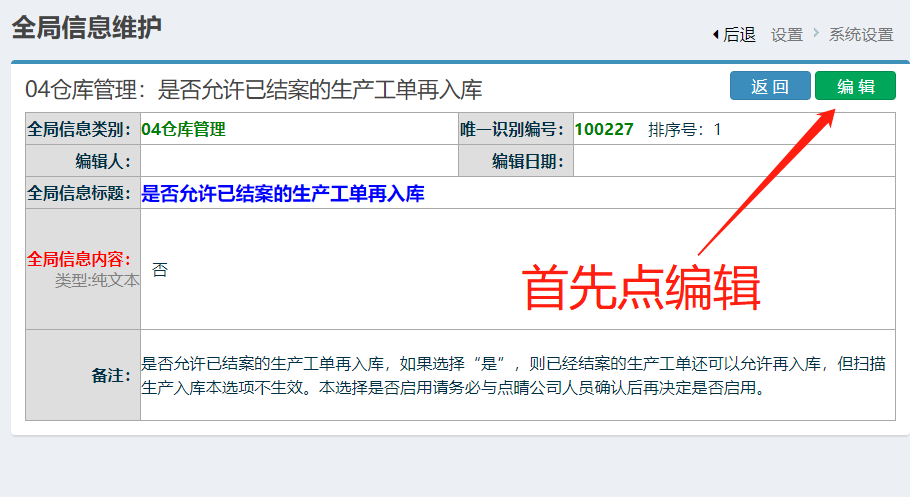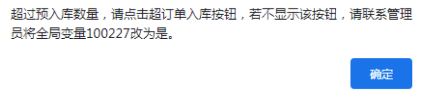 点晴模切ERP-新增生产入库单时提交提示:超过预入库数量,请点击超订单入库按钮,若不显示该按钮,请联系管理员将全局变量100227改为是