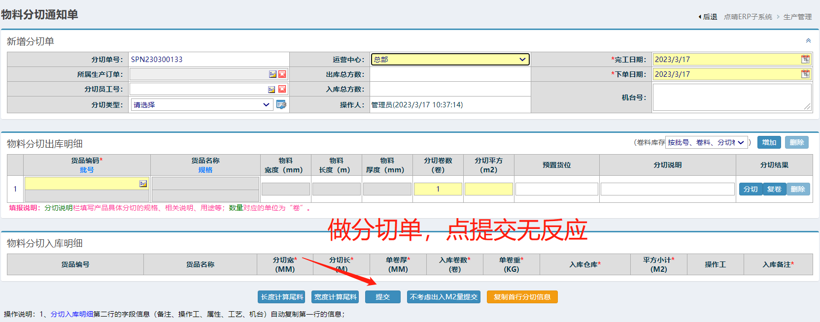 点晴模切ERP-做好分切单后,为什么点提交没有反应呢?