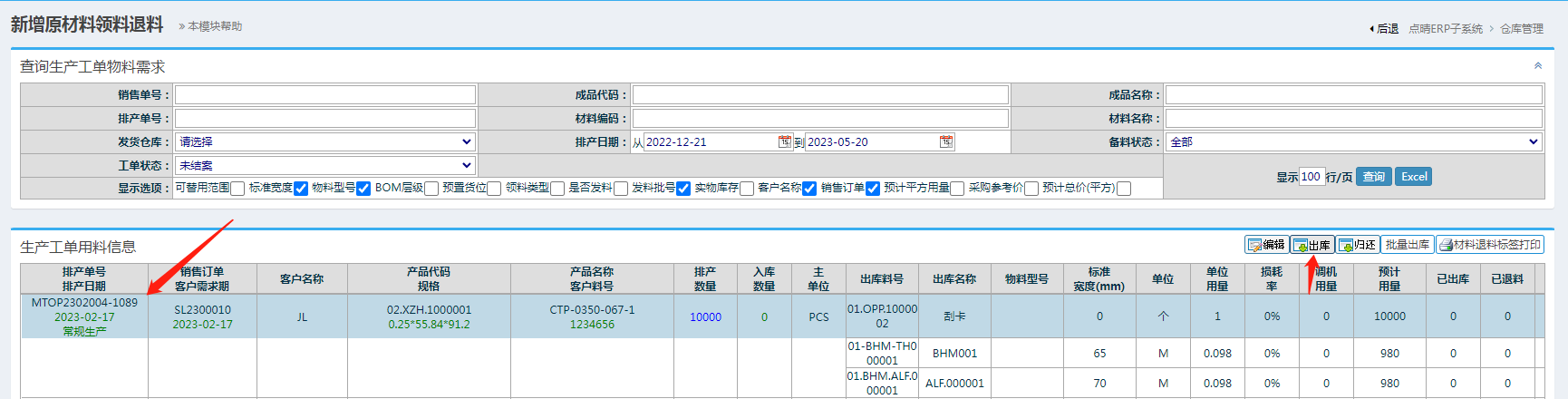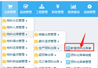 仓库管理-物料出库管理-生产领料出库-新增领料出库单