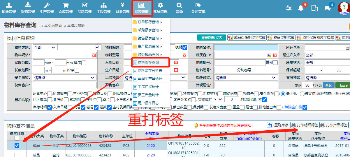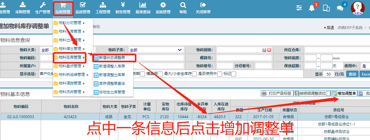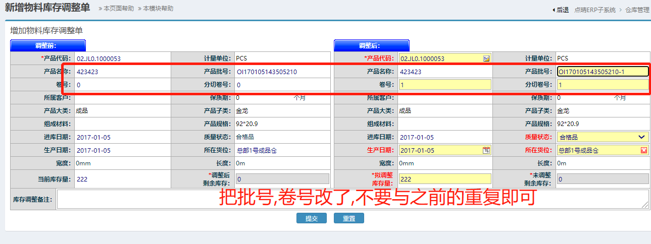 点晴模切ERP-在库调整操作-调整批号卷号重复的情况