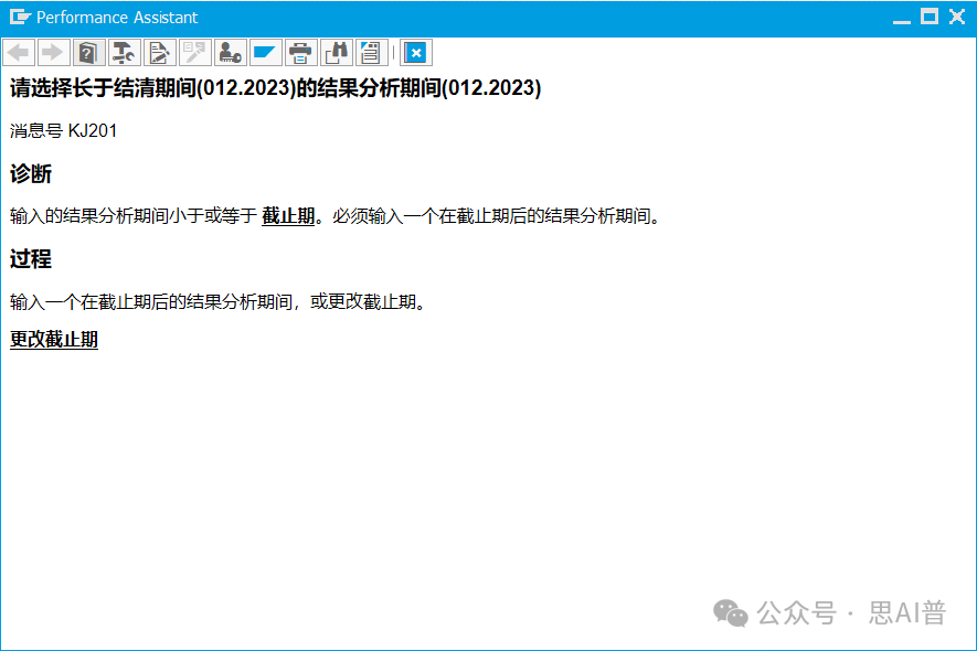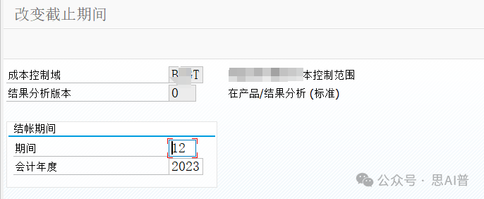 结账期间 期间 和 会计年度 结转在制品的上个月 比如计算2024年1月的在制品,则需要把日期设置为2023年12月 可以理解为:要关闭的期间 如果选择的不对,执行KKAO的时候会报错,如图 请选择长于结清期间(012.2023)的结果分析期间(012.2023)