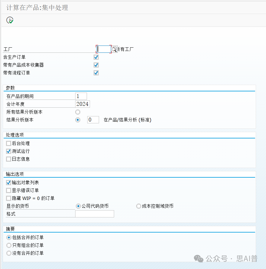 工厂:根据在制品订单所在工厂选择 订单类型:根据需求选择或者都选 在产品的期间 和 会计年度: 计算在制品订单的期间 结果分析版本:根据客户定义,一般都选0 测试运行先勾上,无问题在去掉勾 输出选项:输出对象列表 隐藏WIP=0的订单勾上(0的订单不显示)