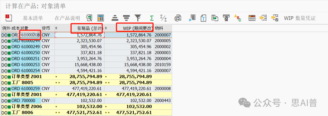 WIP(期间更改)即当月的在制品金额=当期生产订单投入-当期生产订单产出 计算出来在制品金额之后执行CO88,CO88依照此金额结转在制品,这里可以按照订单自行计算检查一遍在制品计算是否正确 比如 执行事务代码进行在制品检查 CO03