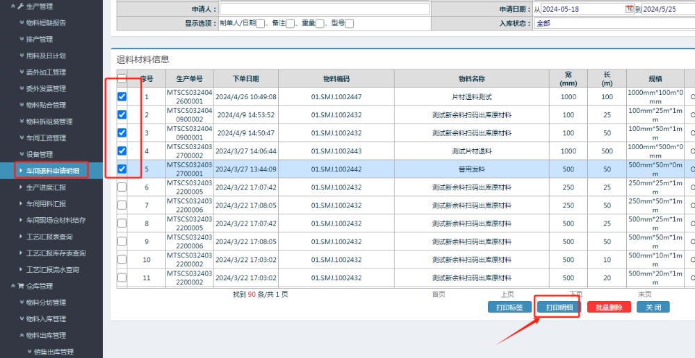 扫码退料的,在车间退料申请明细表里面 勾选打印。