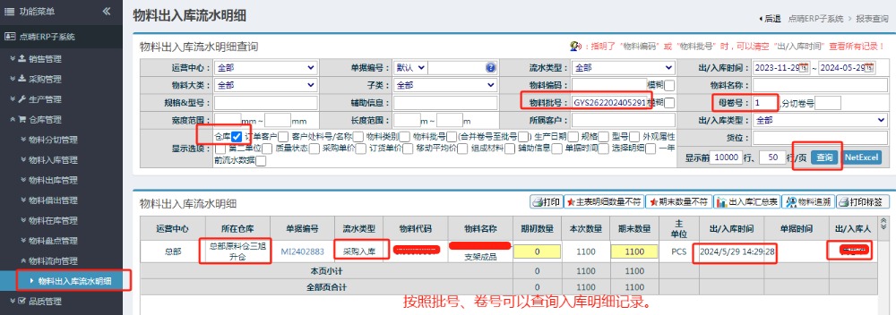 复制库存表的批号、卷号信息,进入仓库管理--》物料流向管理--》物料出入库流水表。输入批号查询条件进行出入库记录查询。