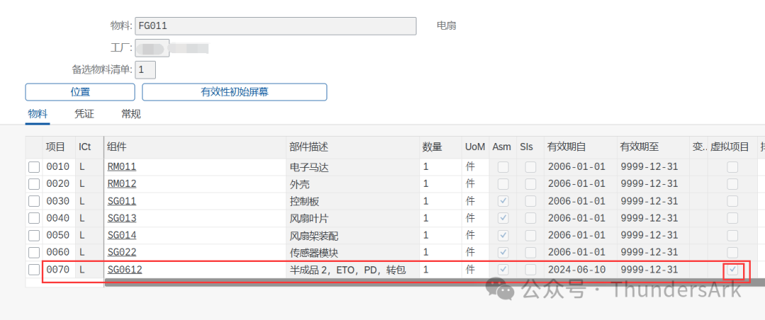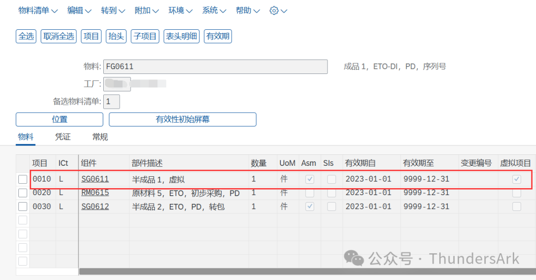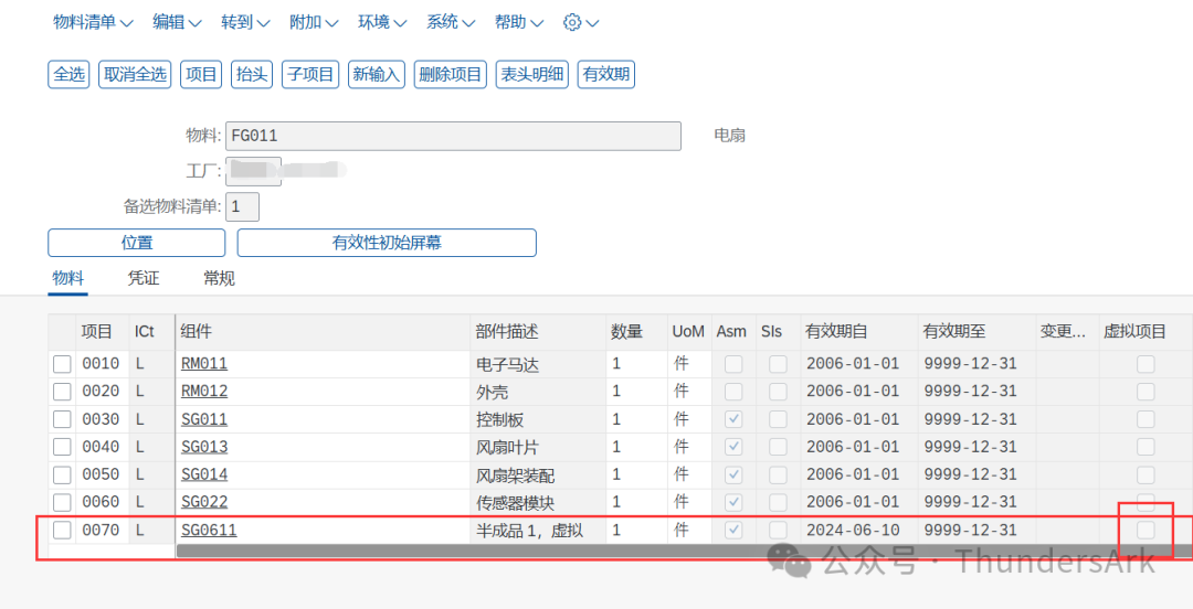 在BOM物料清单中,被设置为虚拟物料的半成品的虚拟项目将被默认打上勾且不可更改。