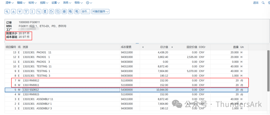 我们为该产成品创建一张生产订单,下达后,观察其成本项目。