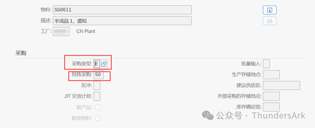 若想将一个物料设置为虚拟物料,我们需要在该物料的MRP2视图中将其采购类型设置为E,特殊采购类型设置为50,如下图所示: