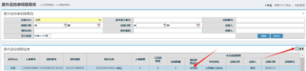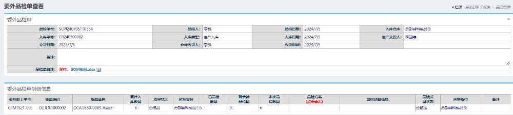 操作步骤:品质管理-委外入库管理-品检单明细查询,如下图所示: