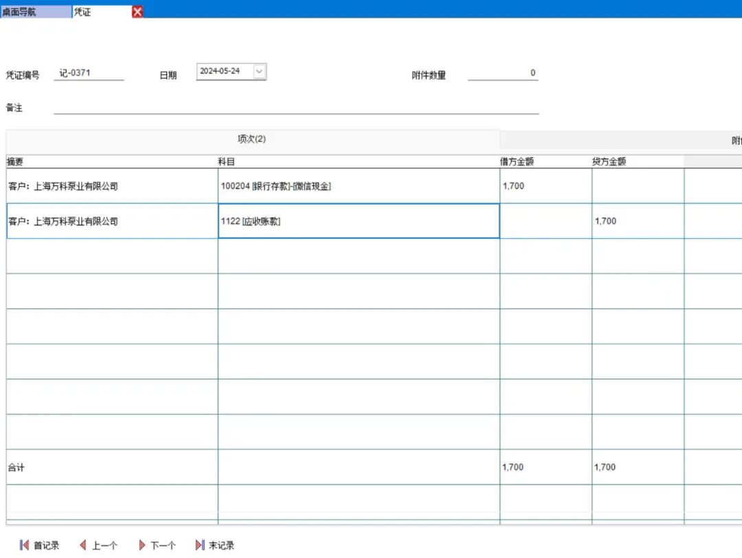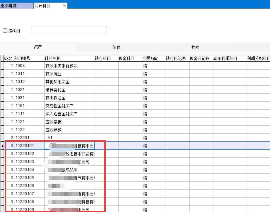 注意上图的贷方科目就不是一级科目了,在建客户资料表时会自动生成该客户一个应收账款的下级科目: