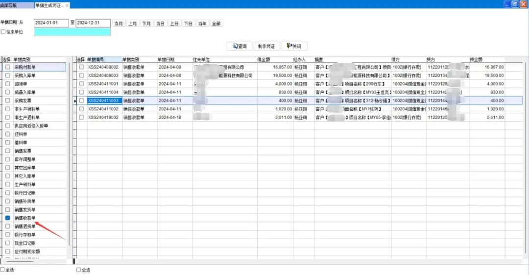 手工生成凭证 销售收款单自动生成凭证有个缺点,一旦生成凭证后销售收款单就无法修改和删除,给工作带来很多不便。因此,可以每月财务人员手工批量生成凭证。 生成凭证前财务先确认所有销售收款单都已修改完成。 单据生成凭证(总账-凭证-单据生成凭证)中只勾选销售收款单,点制作凭证即可: