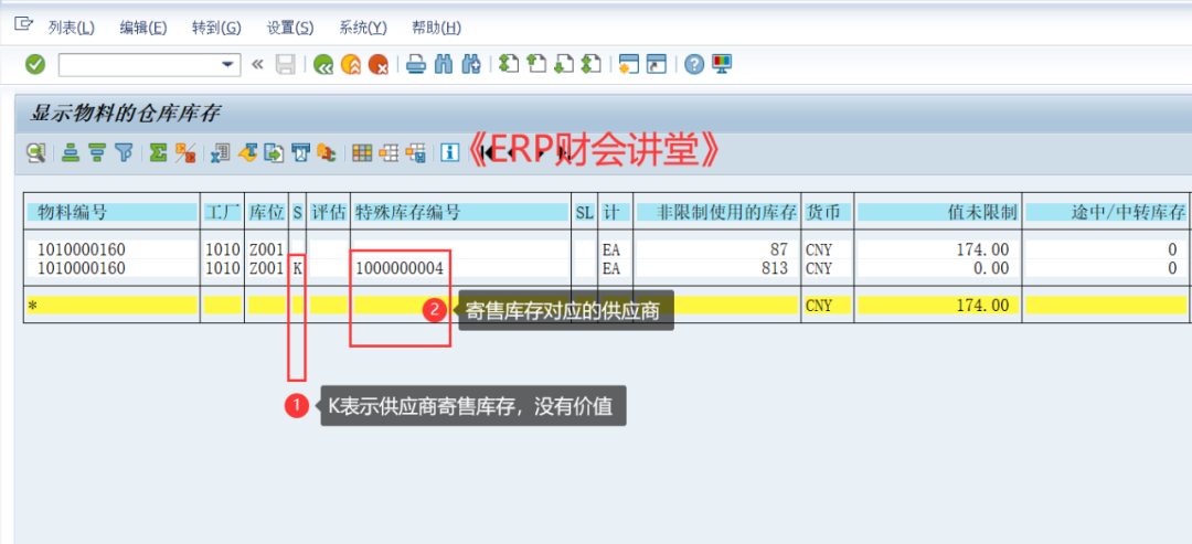 寄售采购订单,项目类别选择“K”,无需输入价格。 第二步,仓库收货,和正常的采购订单收货一样,MIGO收货即可。收货后,可以看到库存为寄售状态。MMBE查看库存如下:
