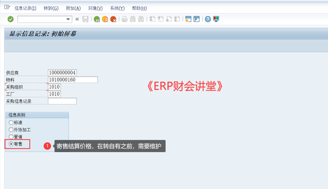 记账金额等于数量乘以单价,数量是已知的,价格从哪里取的呢? 对于寄售业务,创建采购订单时是没有价格的,结算价格通过信息记录进行管理。在寄售转只有之前,需要维护供应商寄售结算价格。ME13查看寄售价格如下: