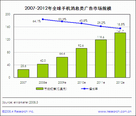 艾瑞咨询 周军伟 企业之间的营销竞争比以往来得更早、更猛,其中移动营销工具再次成为商家差异化竞争的杀手锏。目前短信营销/短信广告是移动营销的最主要组成部分。 随着3G网络在中国的开展、移动运营商对移动数据业务的重视、智能手机终端的以及无线上网用户的稳步增长,2009年全球无线广告市场规模预计将达到64亿元,2008-2010年的年平均复合增长率为50%。