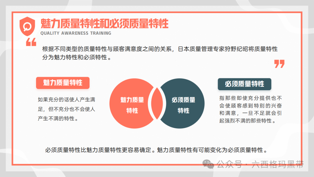 • 魅力质量特性:这些特性是超出顾客基本期望的,当它们得到充分满足时,会极大地提升顾客满意度和忠诚度,但即使它们未被完全满足,也不会导致顾客的不满。例如,产品的独特设计、额外的增值服务或超出预期的售后服务等,都属于魅力质量特性的范畴。企业通过不断创新和提升这些特性,可以创造独特的竞争优势,吸引并留住顾客。