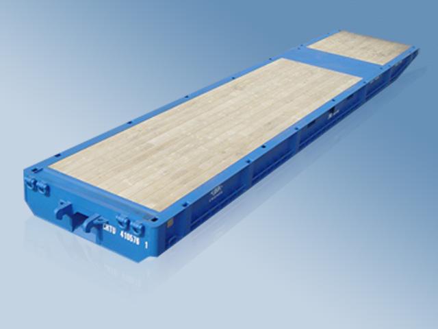 ![]() 框架集装箱(flat rack container)没有箱顶和两侧,其特点是从集装箱侧面进行装卸。以超重货物为主要运载对象,还便于装载牲畜,以及诸如钢材之类可以免除外包装的裸装货。还可以便于大型超宽,超高货物的吊装。 7、平板集装箱![]() 平板集装箱(platform container)形状类似铁路平板车,是具有高承载能力的底板而且没有上部结构的集装箱。适宜装超重超长货物,长度可达6米以上,宽4米以上,高4.5米左右,重量可达40公吨。且两台平台集装箱可以联结起来,装80公吨的货,用这种箱子装运汽车极为方便。 8、开顶集装箱