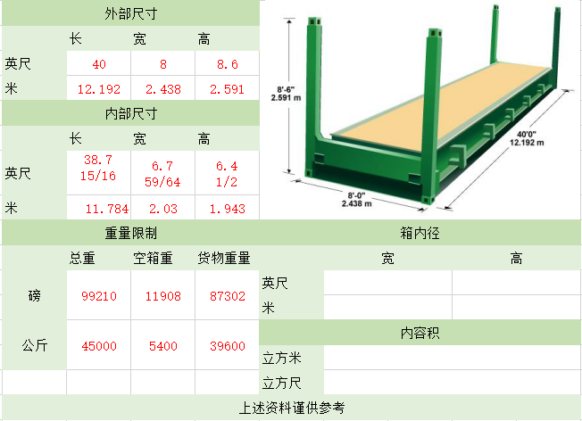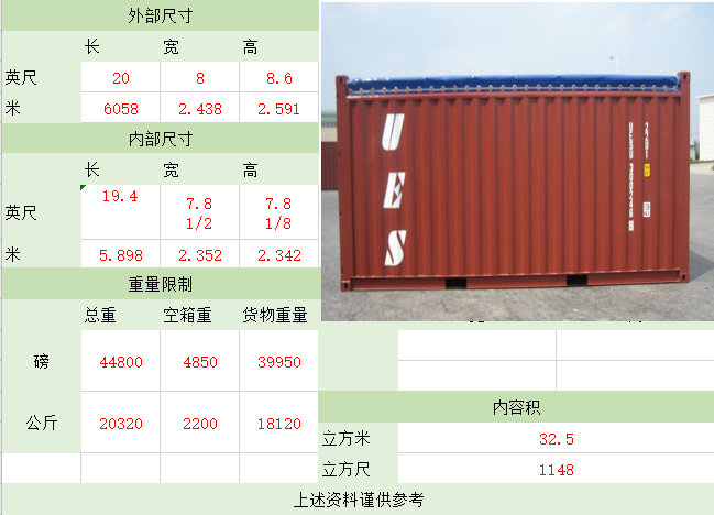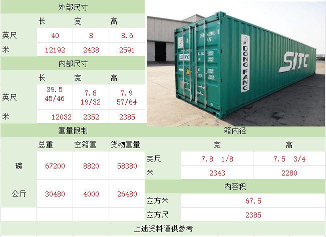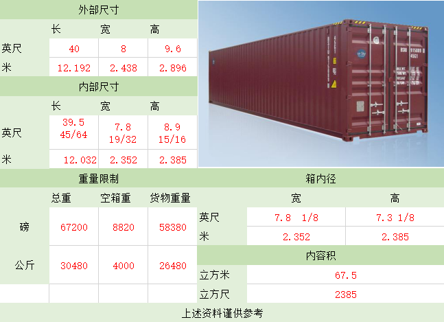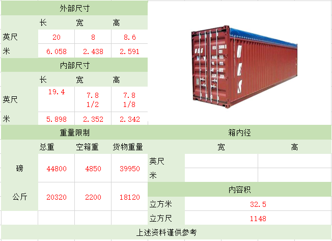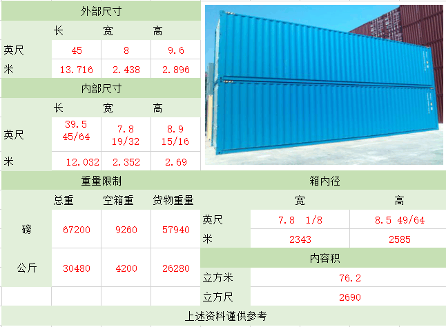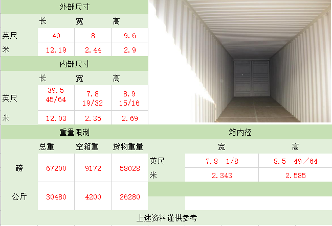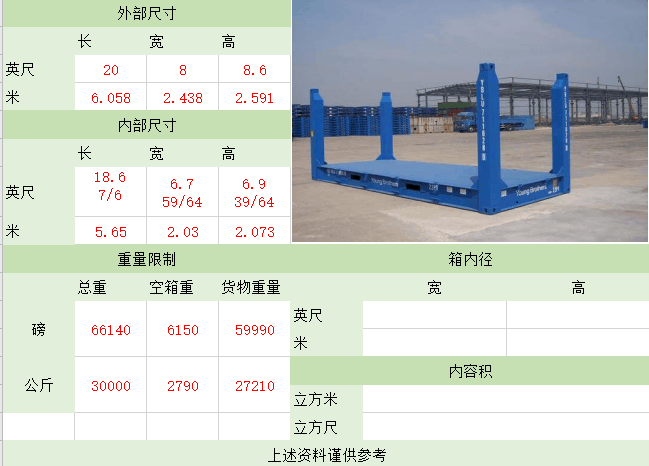 备注:集装箱适用于装载大型货物和重货,如钢铁、木材,机械,特别是像玻璃板等易碎的重