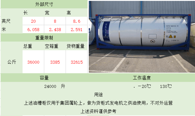 备注:这种集装箱是专为装运液体货物,如酒类、汽油、化学品而设计的