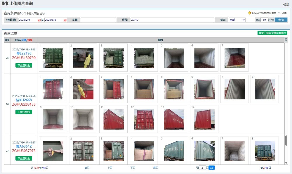 如果采用点晴集装箱装柜拍照上传小程序(介绍网址:http://www.hgtp.cn),那么拍照完毕后就可以立即通过微信小程序上传到服务器,之后货主或承运商等相关人员可以立即在网上登录到点晴货柜图片管理平台查询到相应的集装箱装柜图片,支持直接图片下载、图片rar压缩打包下载、图片组按照指定格式生成PDF文件下载等,公共查询网址:http://hgcx.oa22.cn