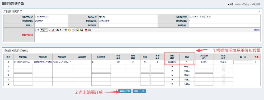 3.进入编辑界面后,根据情况填写单价和数量,然后点击编辑订单