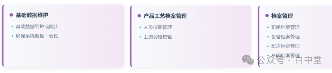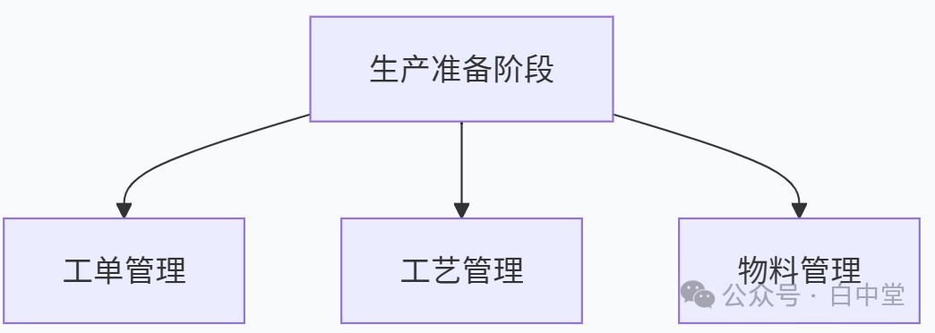 再进一步可按照颜色块和功能布局,把生产过程分为四大阶段,N个控制点。白中堂命名为:基础数据管理、生产准备、生产执行、产后分析。一、生产过程的四个核心阶段1. 基础数据管理阶段:打好生产管理的地基