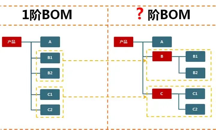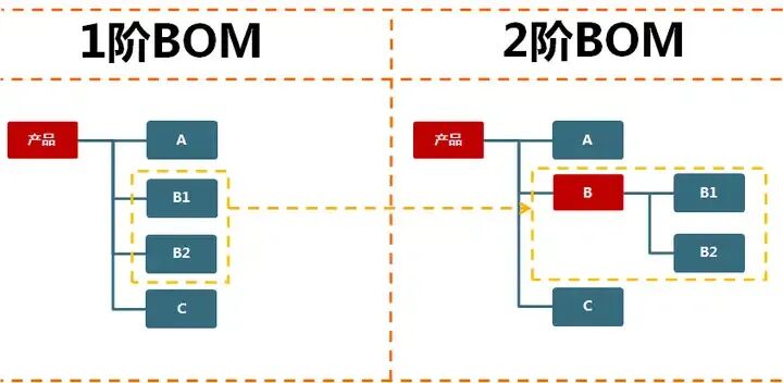 5、BOM断阶原则 企业里的产品和材料都好识别及整理,但半成品比较难确定,涉及到库存管理方式、计划管理方式、生产管理方式、成本核算方式等。 一般而言,一个产品每多一BOM阶层结点,就会在单据运作中多一次生产订单 --> 生产领料 --> 产品入库的循环 所以,BOM断阶最简单的方法是半成品是否入库,方便成本核算。
