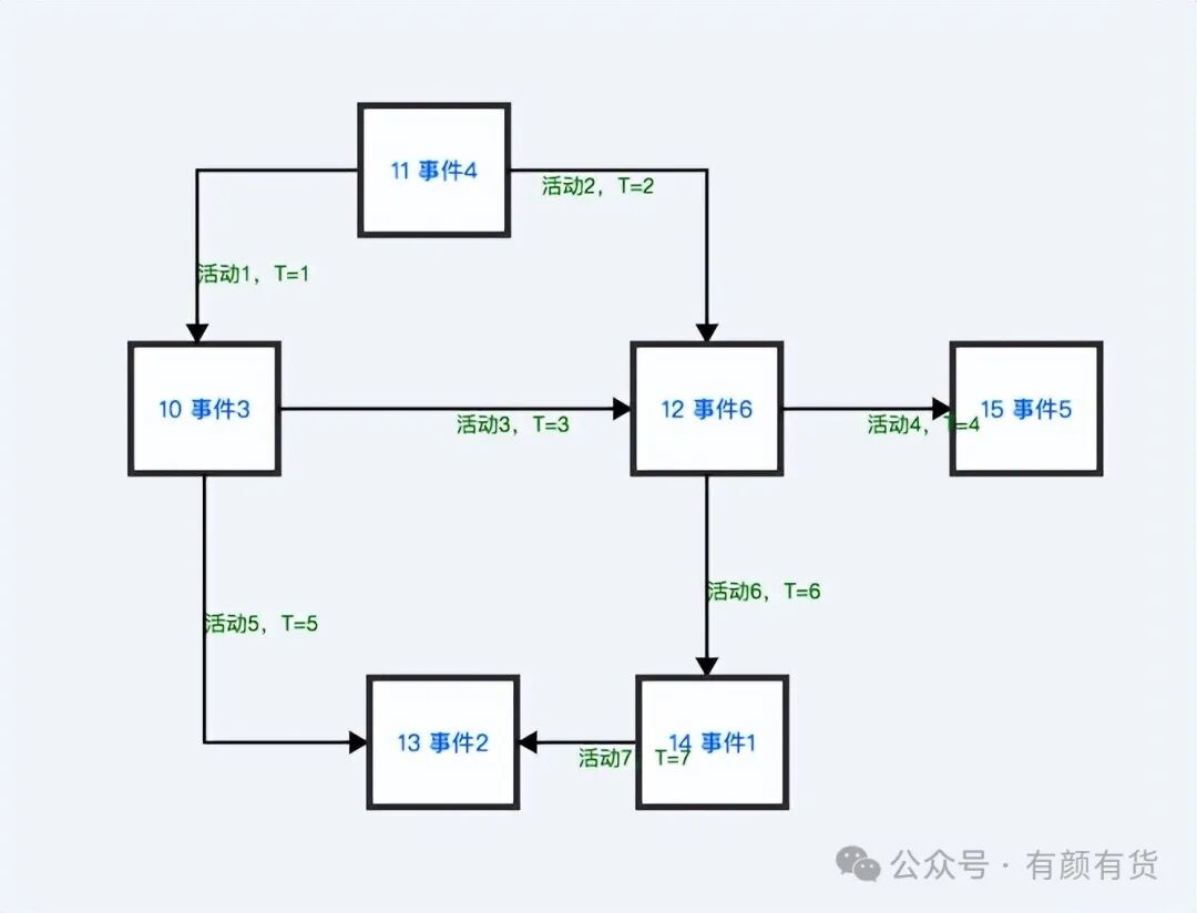 2. 顶点上所有前置活动完成后,才能进行后置活动:活动4 -> 活动6 和 活动3-> 活动6 都完成后,才能进行 活动6 -> 活动1 或 活动6 -> 活动5。