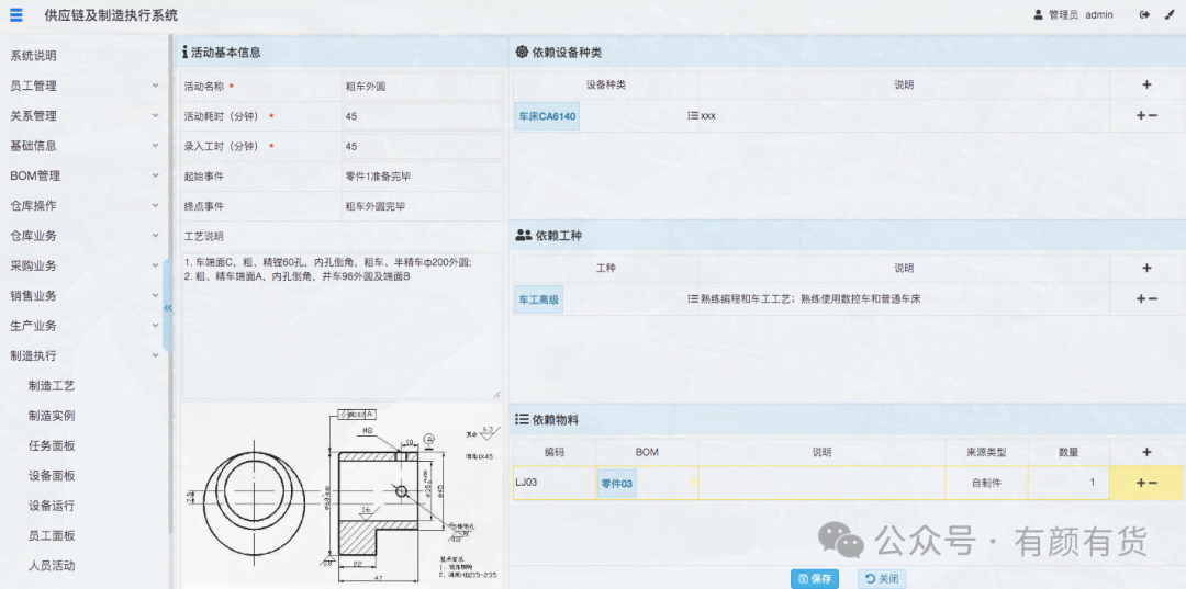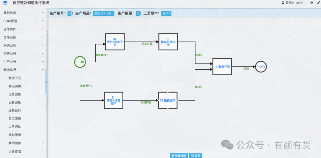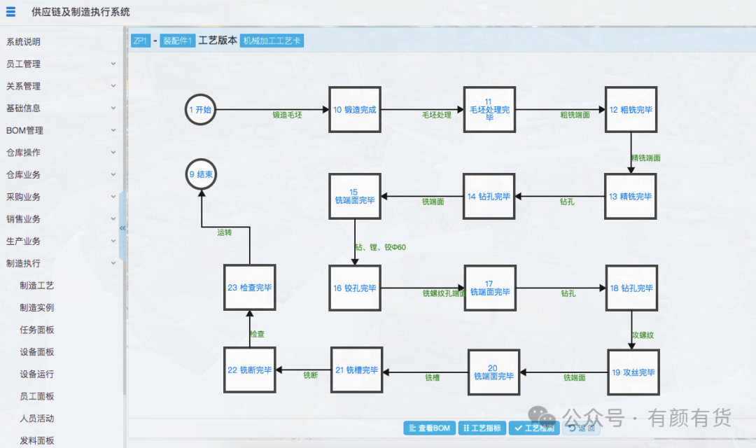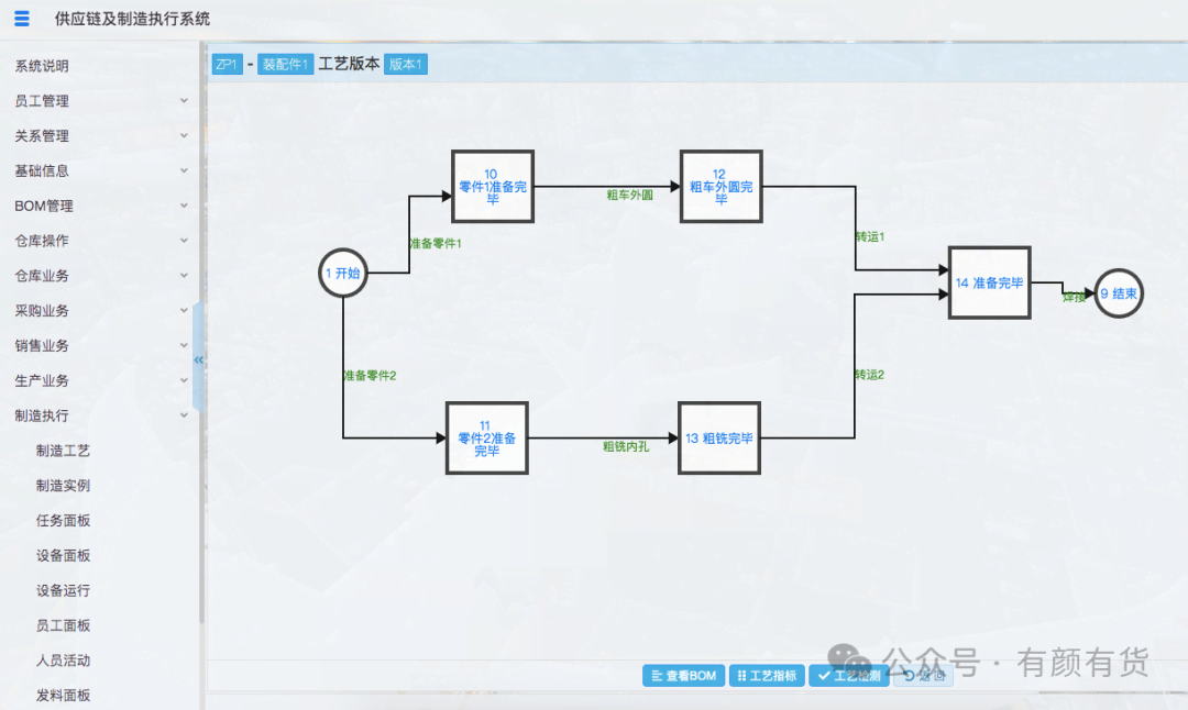 基于AOE网,建立的作业流程,即MES制造的核心基础数据。在这个流程数据上,几乎可以做任何文档、图纸、质检、安灯、自动化等等的扩展。