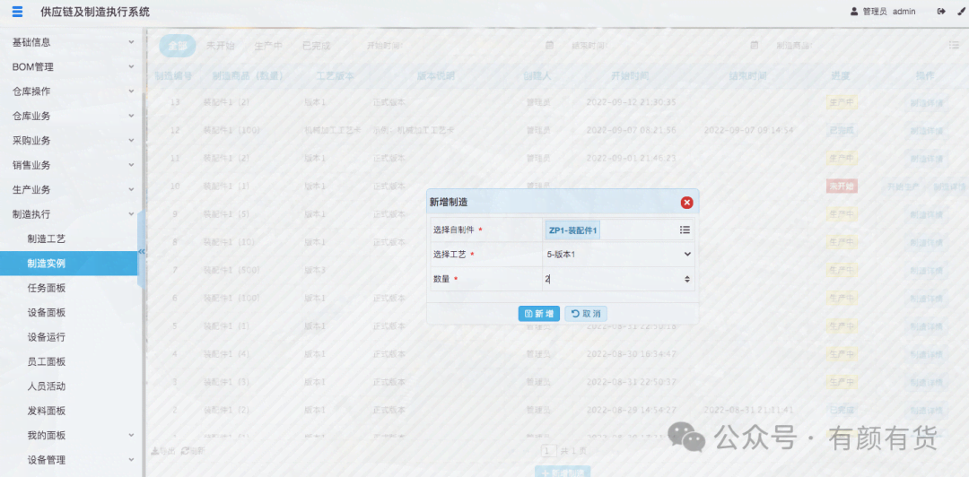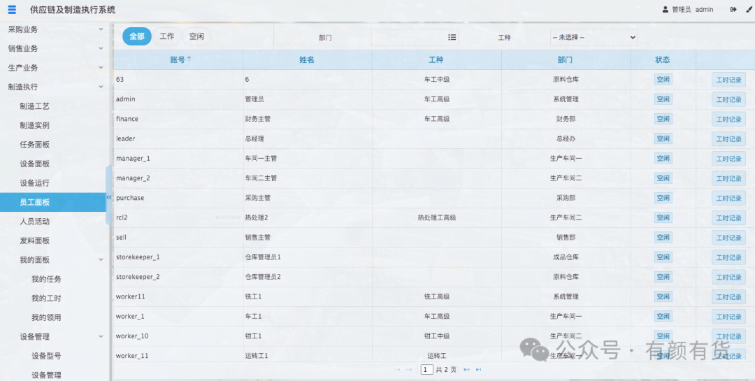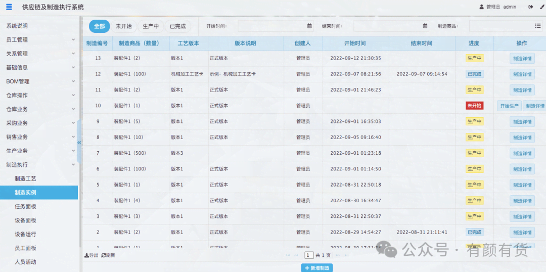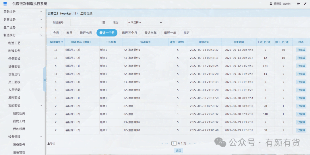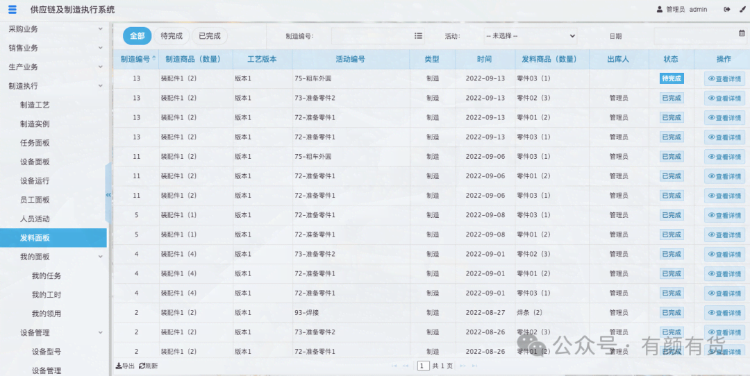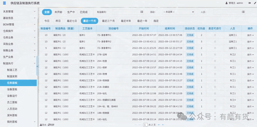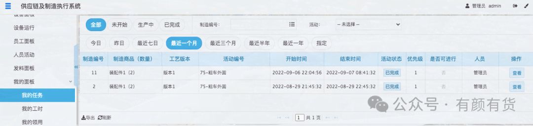 当任务指派后,即会派生一个任务给指派的人员,管理员可以在任务面板查看所有的任务,并可以通过制造实例、人员等进行筛选,员工也可以在我的任务,查看指派给我的任务。