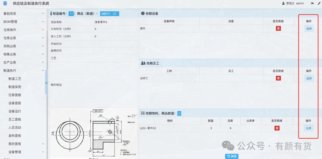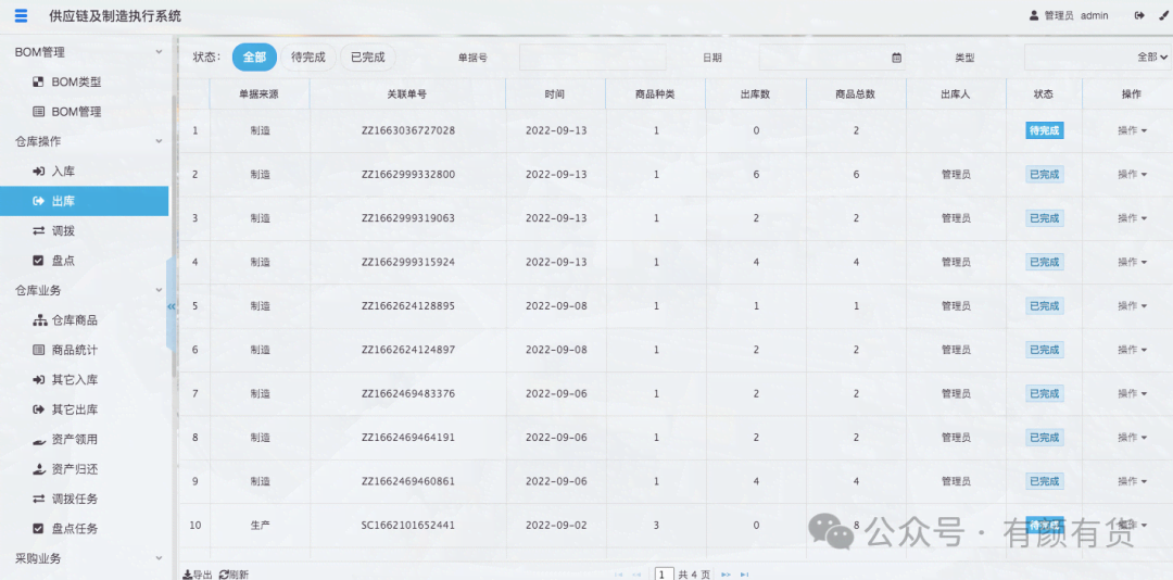 同时在仓库管理-出库单中产生制造类出库单,仓库管理员需完成物料的出库操作:
