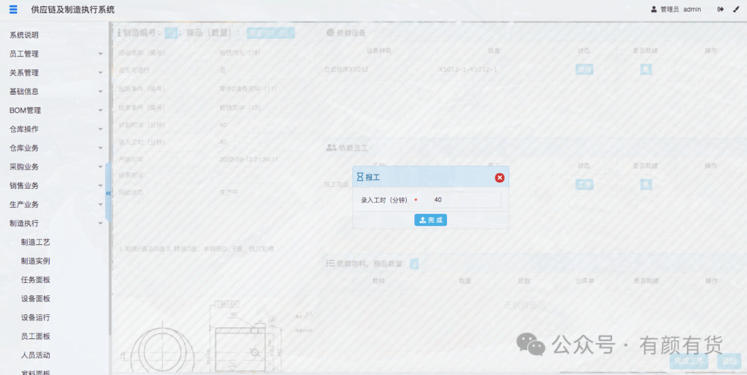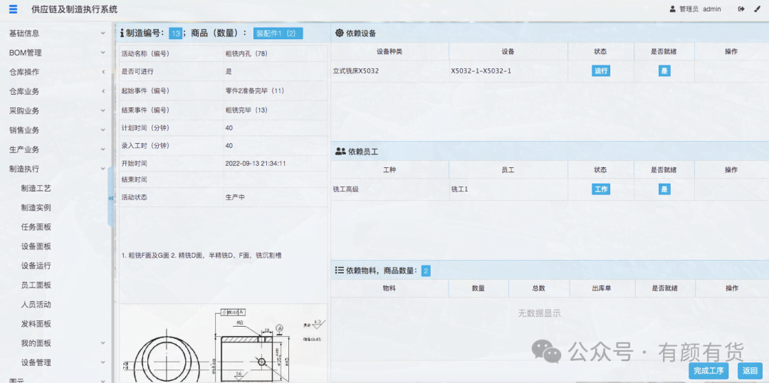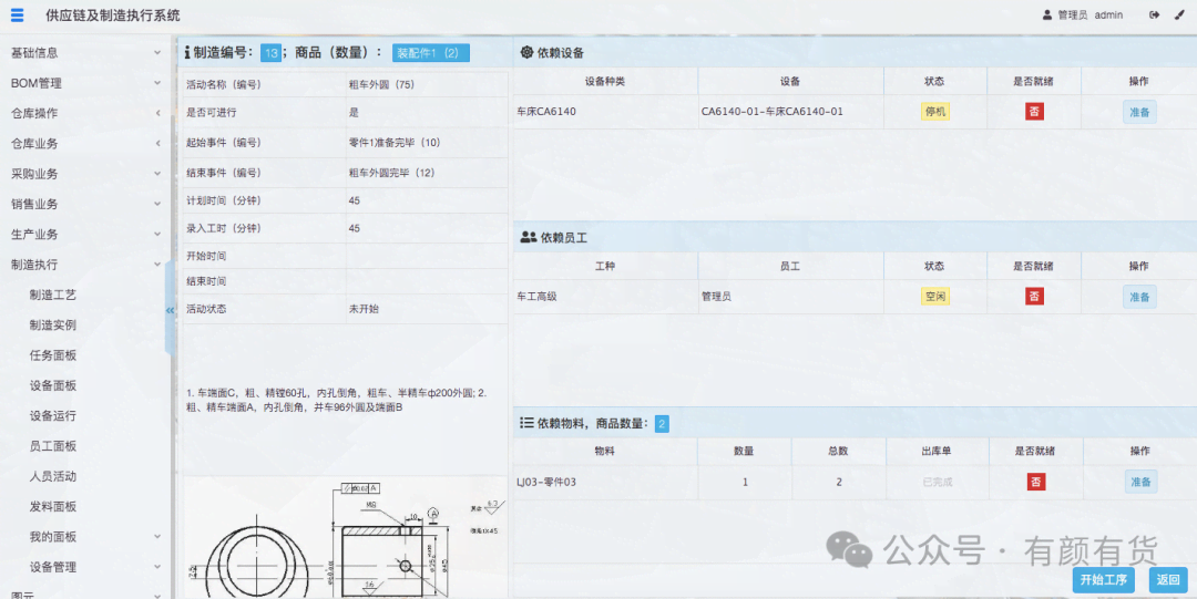 当所有依赖的设备、人员、物料准备完毕后,活动即可开始,点击开始工序,此时活动变成变成生产中同时标记了活动开始时间