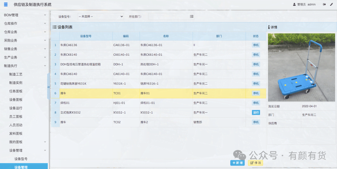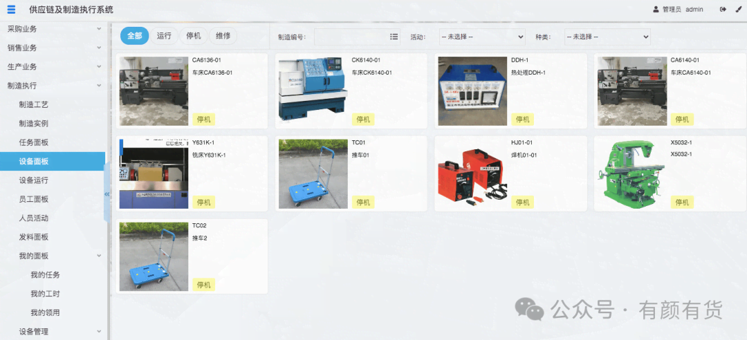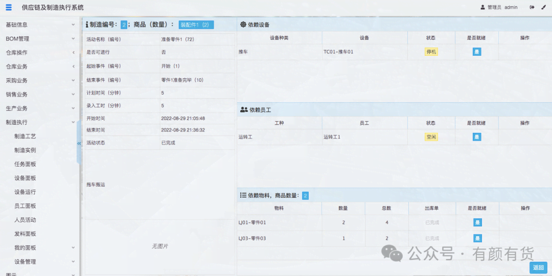 除了上文的制造实例运行图和任务面板,还可以查看设备、人员、出库单等可视化数据: