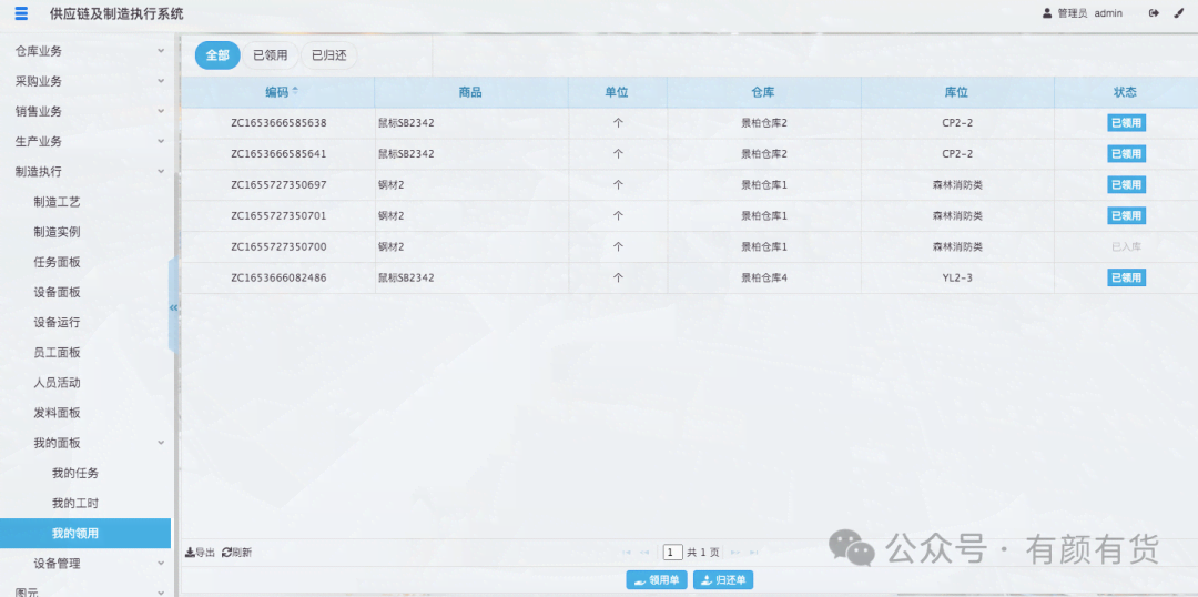 员工可以在我的领用界面,查看自己的领用的物品,下 领用单 和 归还单 领用或归还仓库商品。仓库管理员做出入库操作。