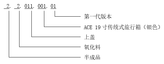 例:物料代码“02.02.011.001.01”代表“ACE 19寸传统式旅行箱(银色) 上盖 (第一代版本) 氧化料”。