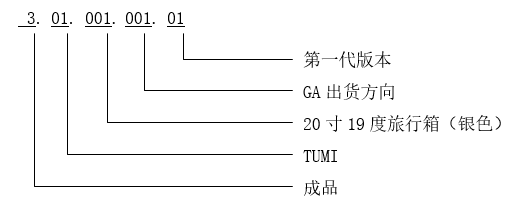 例:物料代码“03.01.001.001.01”代表“GA出货方向的 TUMI 20寸19度旅行箱(银色) (第一代版本) 成品”。