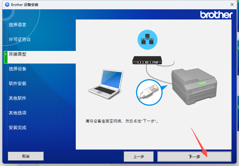 3、接着选择好对应的连接类型(WIFI、有线网络、USB连接),点击“下一步”