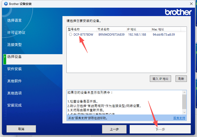 5、接着选择要安装的打印机设备,点击选择设备,然后点击下一步