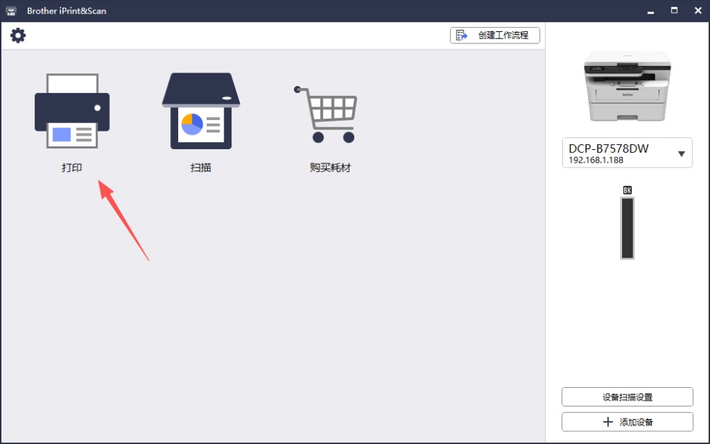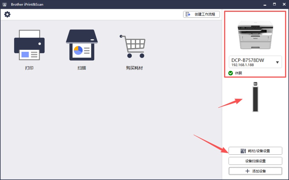 4、完成设备绑定之后,可以在右边的界面直观地看到打印机设备情况以及耗材情况,以及扫描的设置。