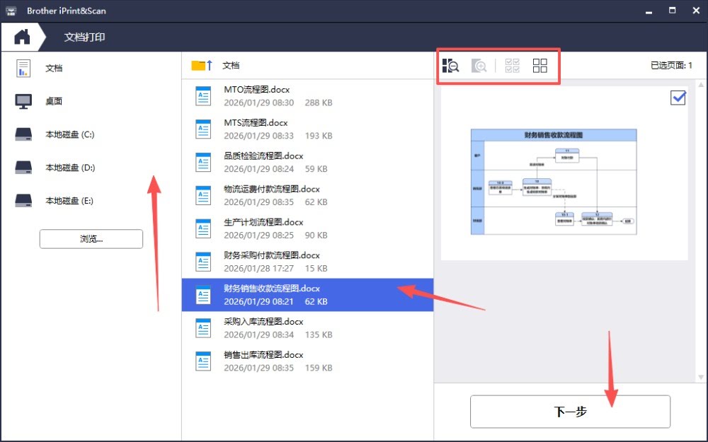 2、选好文件类型后,在电脑目录路径中查找对应的文档文件或者图片点击选择后同时在上方选好页面,点击“下一步