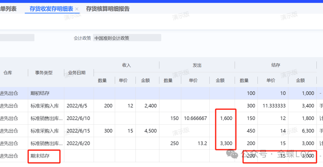 三、实例演算为直观展示先进先出法的计算过程,采用以下业务数据在系统进行模拟: 上表的最终期末结存数量为:100 + 200 - 150 + 300 - 250 = 200个。那么我们来看下发出的单价是如何取的。 先进先出法库存流水账 先进先出法假定先入库的存货先发出,因此发出成本按最早入库的价格计算(结合上面表格)。