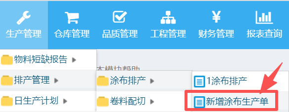 操作步骤:生产管理-排产管理-新增涂布生产单,如下图所示: