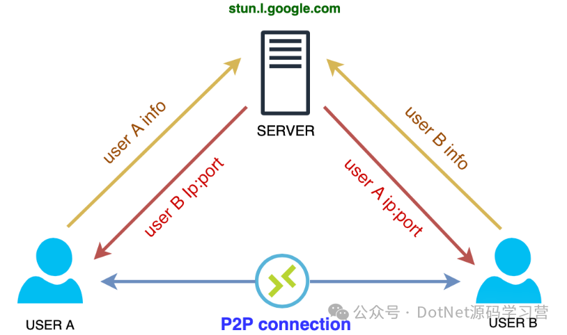 - 交换 IP 后,双方发起连接请求,通过 STUN 服务器(如stun.l.google.com)打通网络隧道。