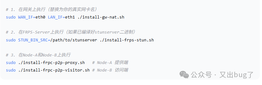 脚本位于仓库docs/scripts/frp-p2p/目录下。将所有脚本拷贝到对应主机,按顺序执行即可。