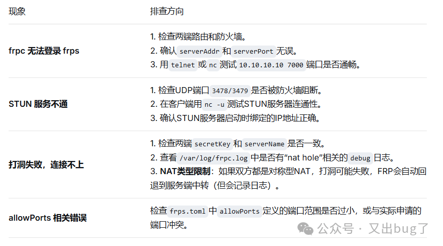 验证直连:在Node-ANode-B上使用ss -tntcpdump查看连接,你会看到对端IP是对方NAT网关的公网IP(如10.10.10.200),而不是frps的IP(10.10.10.10)。