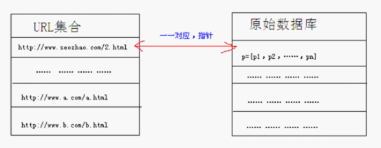 假如蜘蛛爬取的页面的URL是http://www.seozhao.com/2.html,而搜索引擎在此页面经过上述操作后提取到的关键词集合为p,且p是由关键词p1,p2,……,pn组成,则在百度数据库中,其相互间的关系是一一对应,如下图。